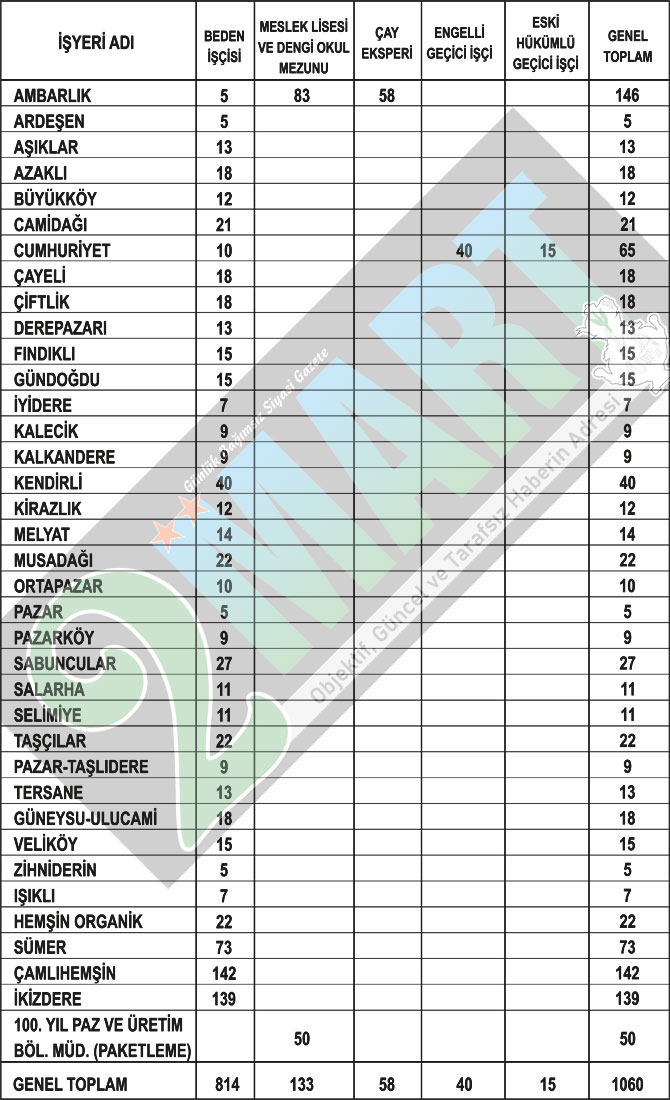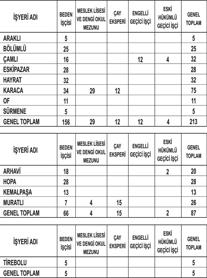 Trabzon’daki fabrikalarda 156 beden işçisi, 29 meslek lisesi ve dengi okul mezunu, 12 çay eksperi, 12 engelli geçici işçi, 4 eski hükümlü geçici işçi olmak üzere 213 mevsimlik işçi istihdam edilecek.